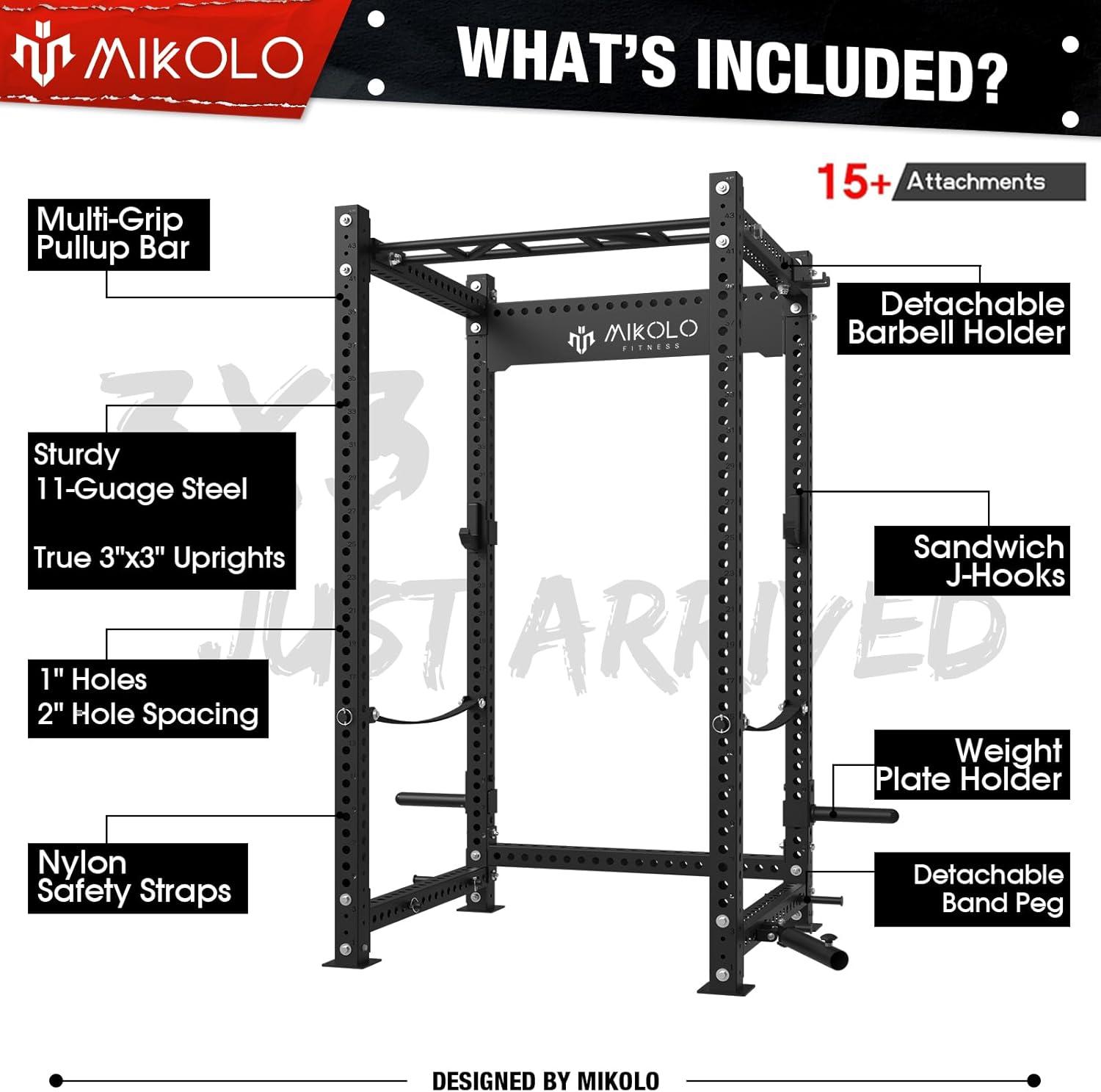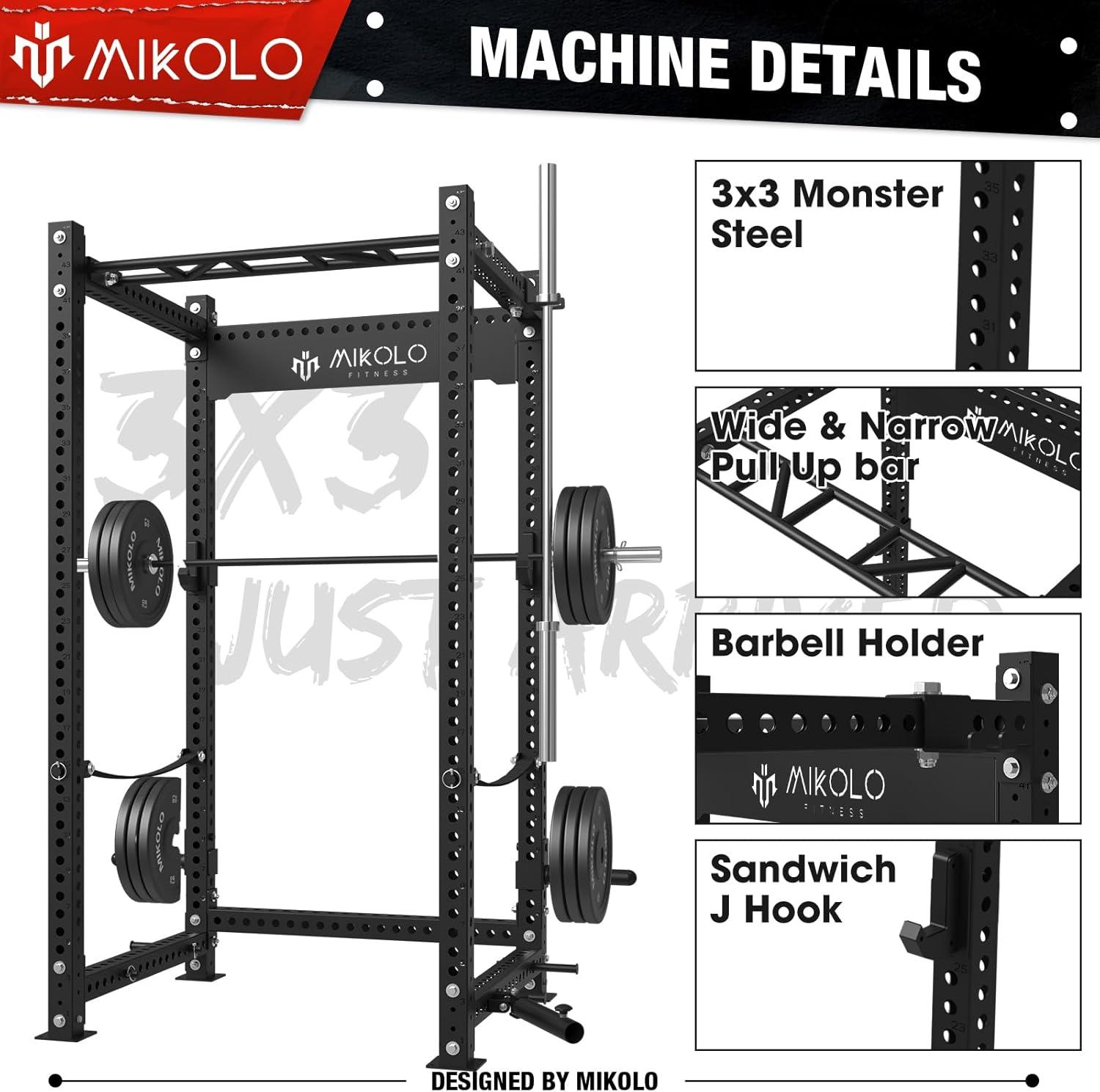 Mikolo Power Cage, 2000lbs Power Rack, Multi-Function Squat Cage, 3″x 3″Commercial Squat Rack for Home Gym with Attachment Set (Red/Black)