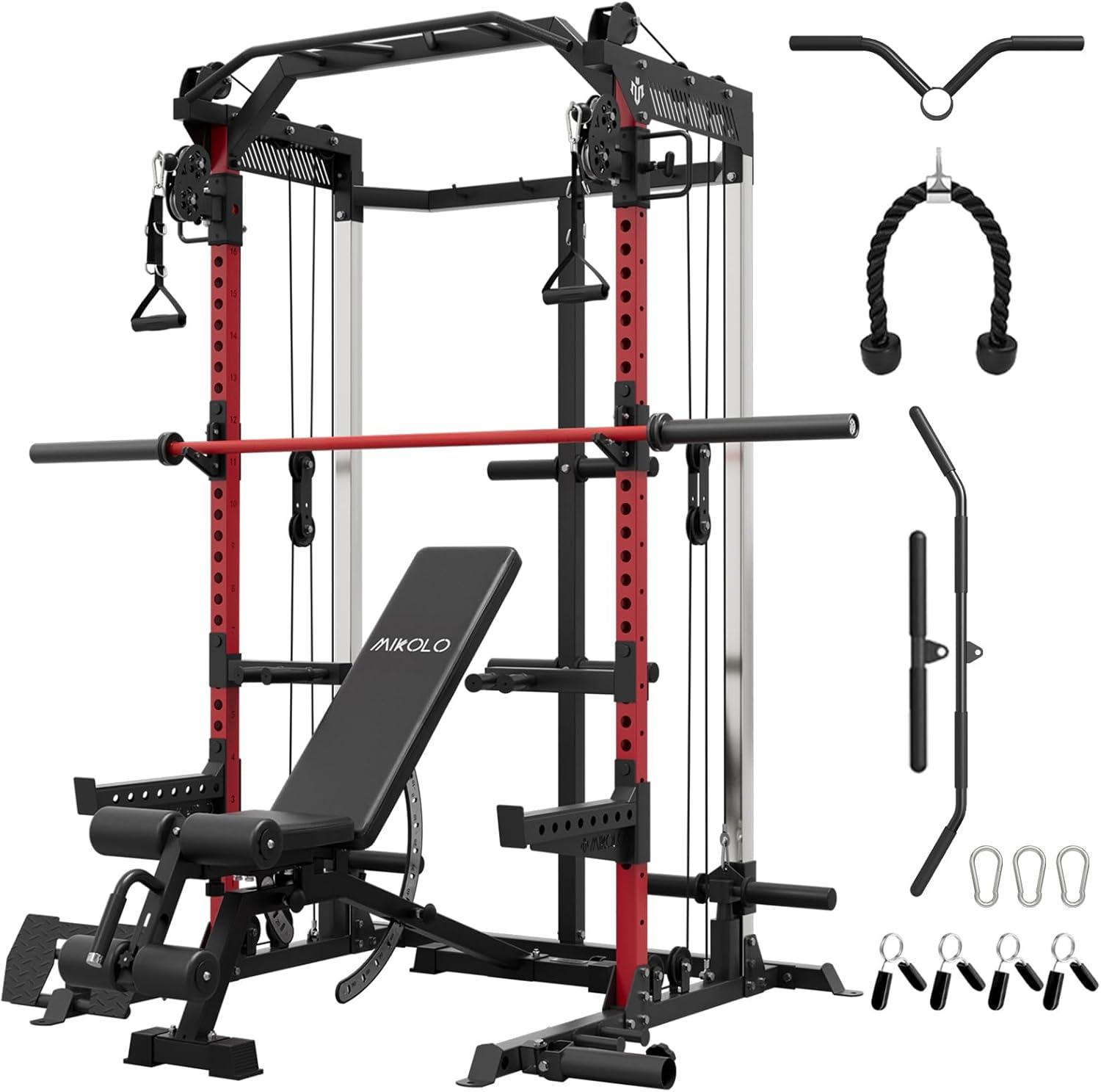 Mikolo Power Cage, 2000LB Power Rack with Independent Dual Pulley System, Multi-Function Home Gym Workout Machine for Cable Crossover(Red)