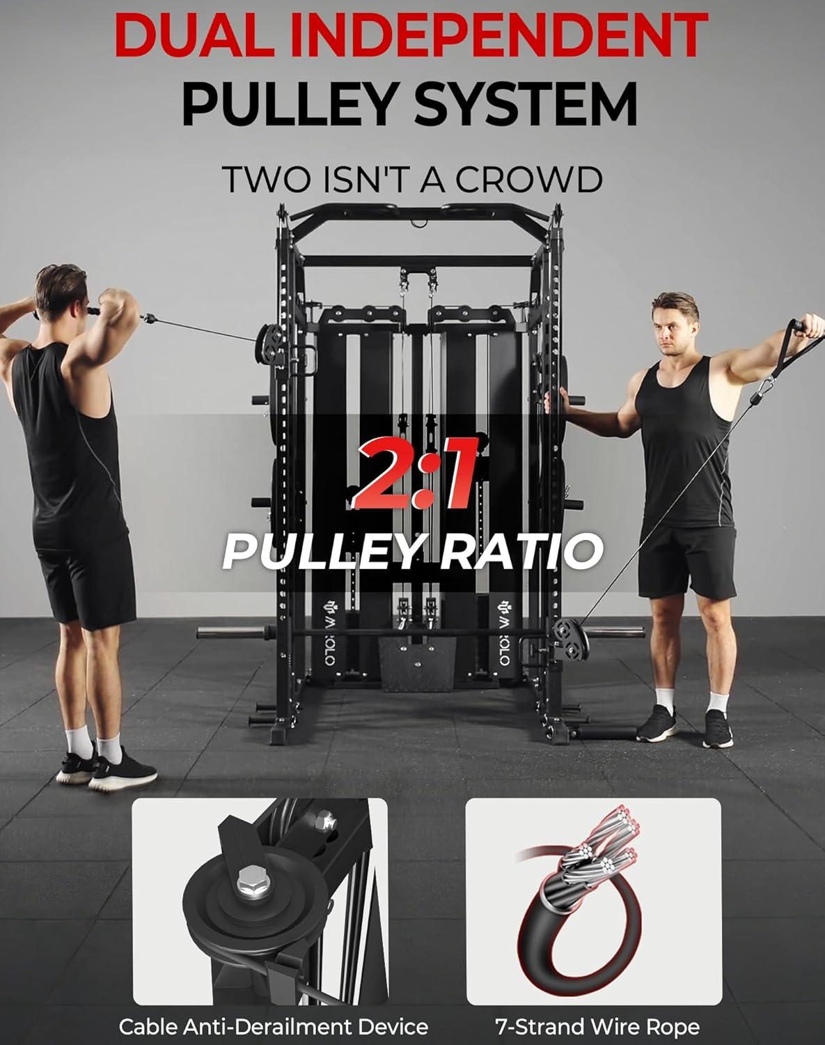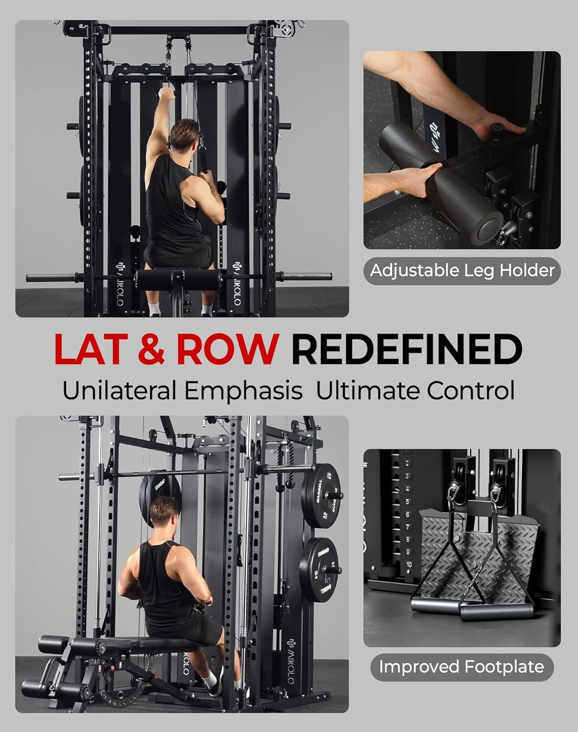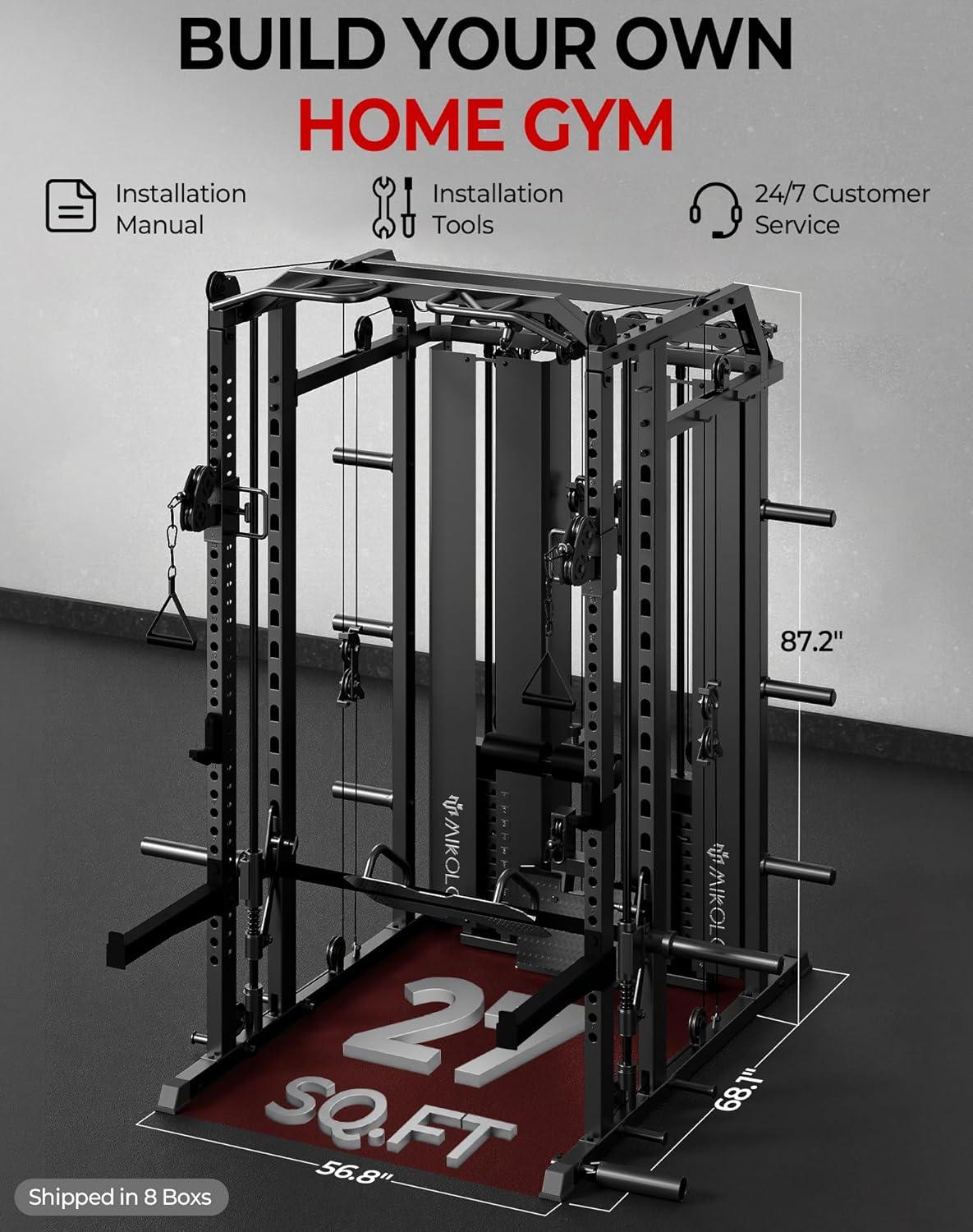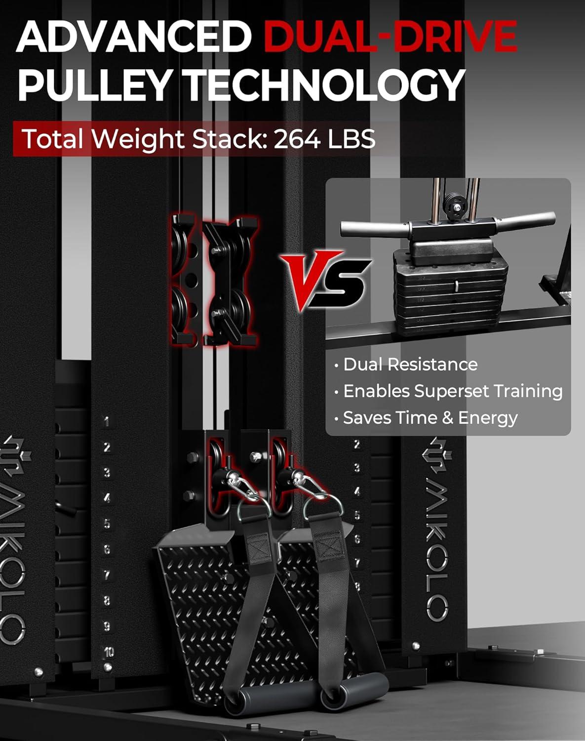 Mikolo Smith Machine with Weight Stack, Power Cage Home Gym System with LAT Pulldown & Cable Crossover, Multi-Functional Trainer with Dual Pulley System, Includes 10+ Free Attachments