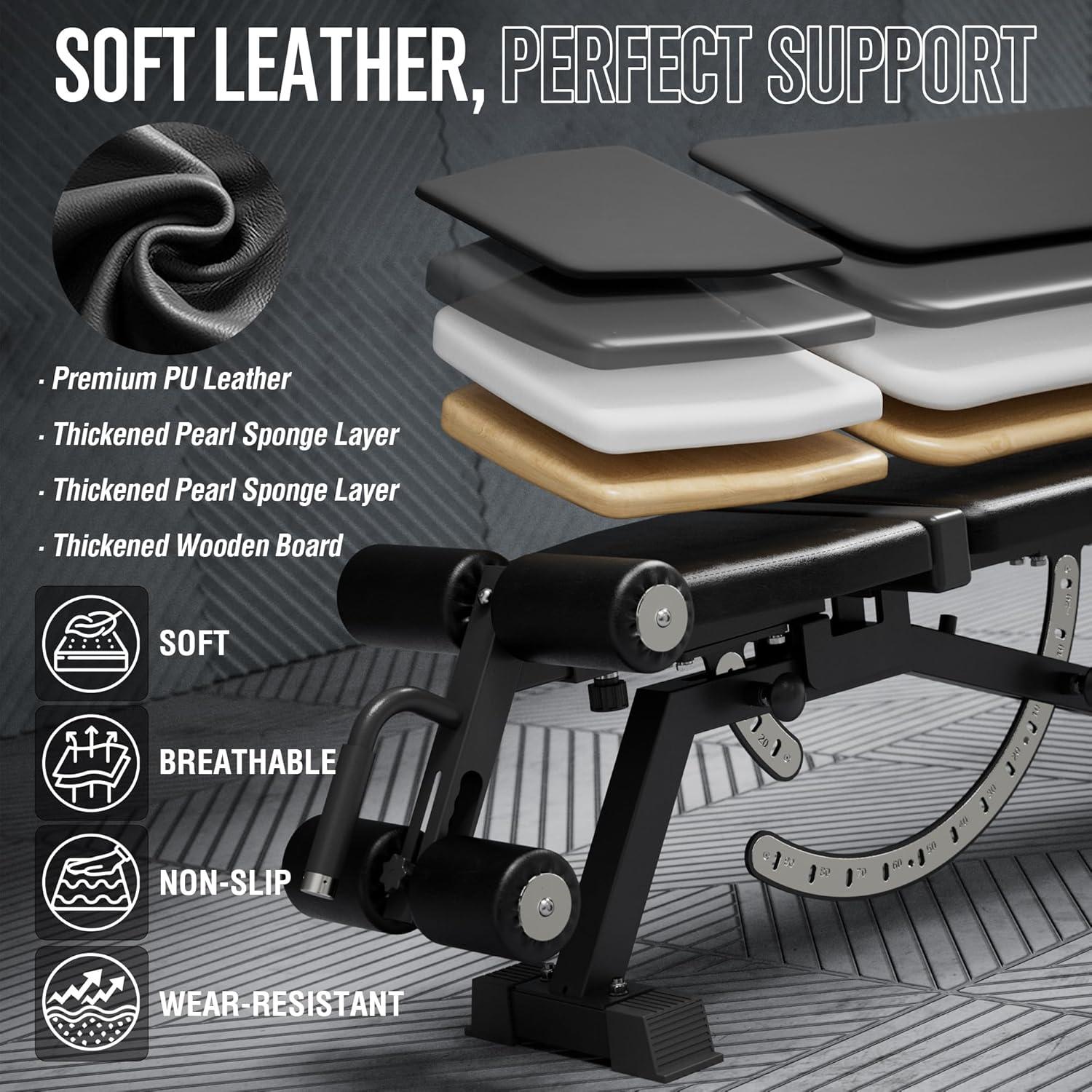 Enhanced Leg Support for Decline Exercises – Upgraded weight bench includes an adjustable leg support that stabilizes your legs during decline movements. The soft foam cushion protects your legs from injuries while you exercise.
