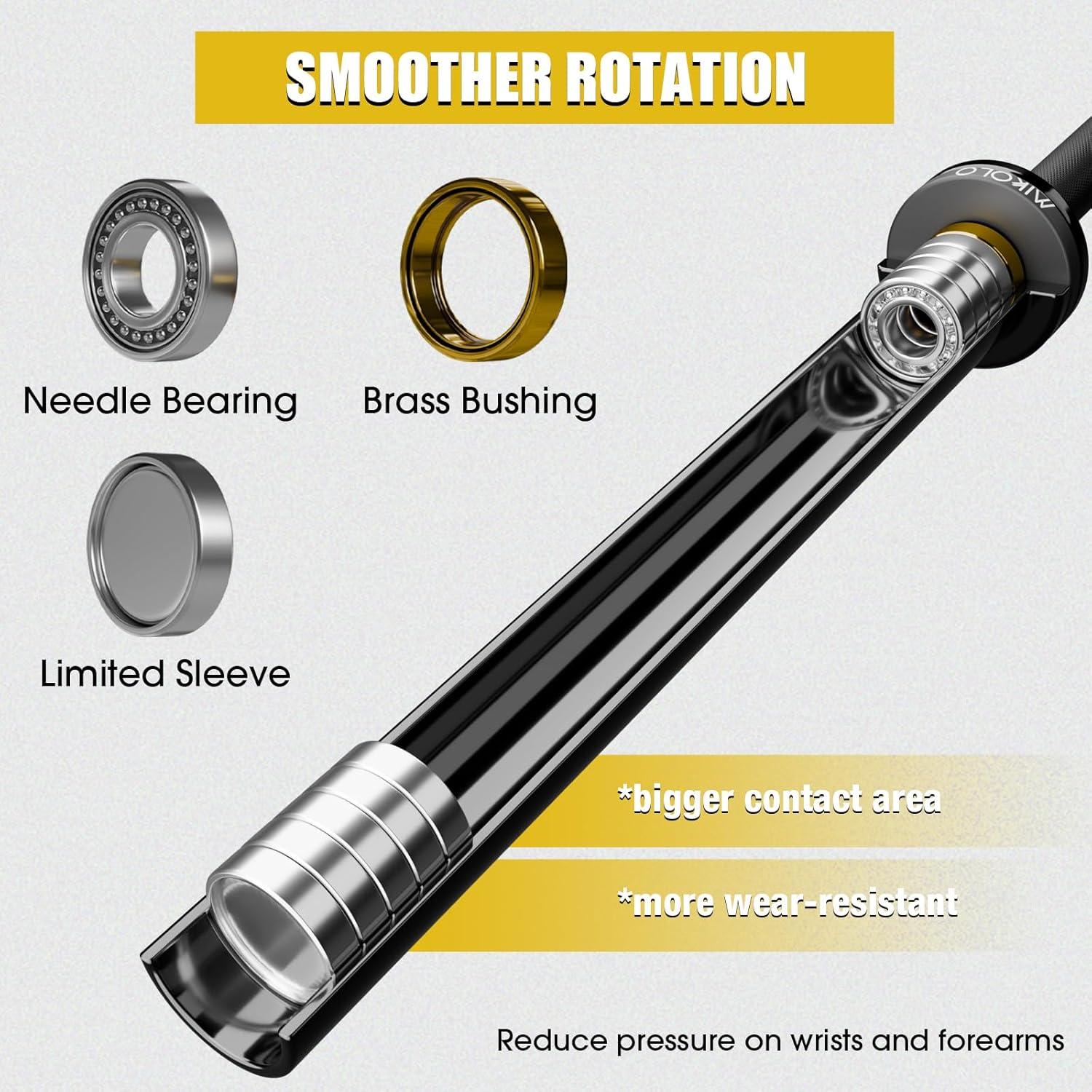 【 High-quality Bearing and Bushing】Mikolo Olympic barbell sleeves feature needle bearings and brass bushings. What sets us apart from other competitive products is our use of 8 needle bearings, providing enhanced friction reduction and catering to the demands of swift weightlifting rotations. Each sleeve end is equipped with snap rings, ensuring stable port positioning.