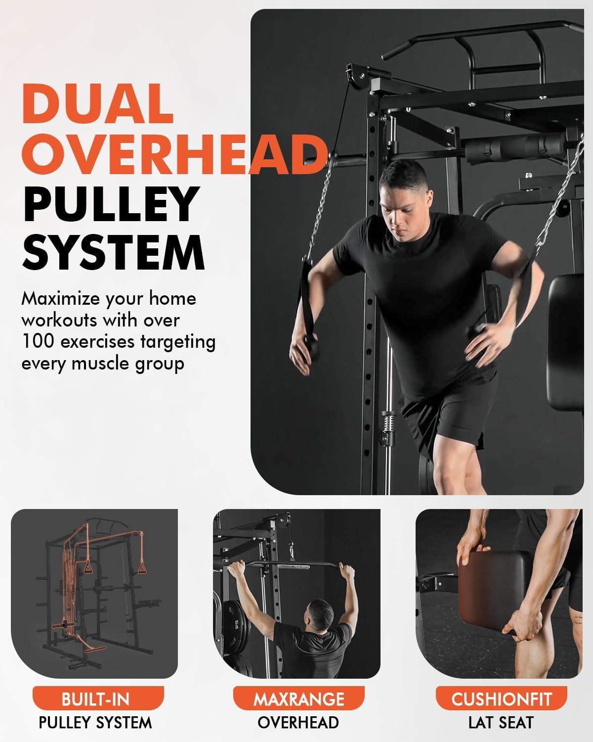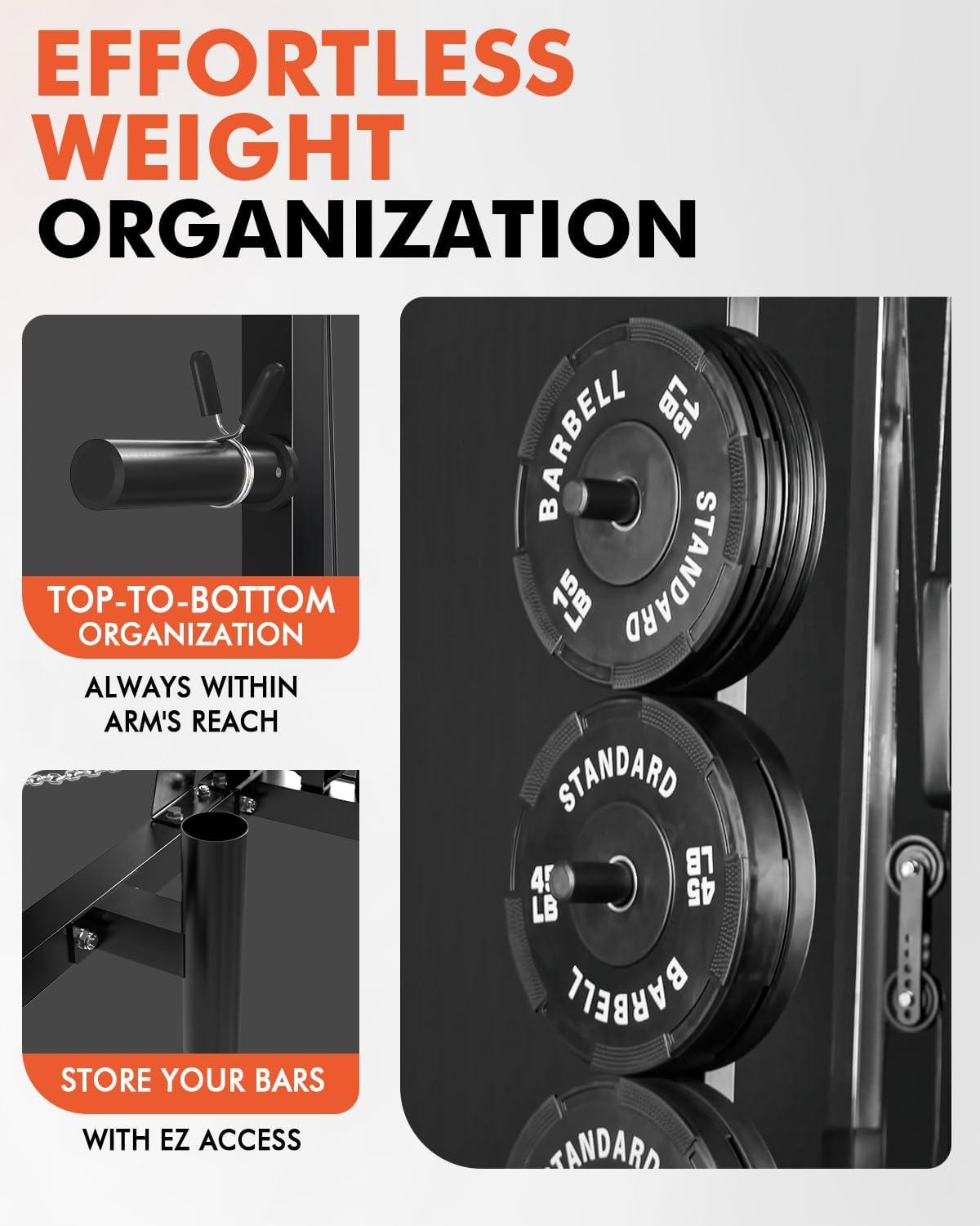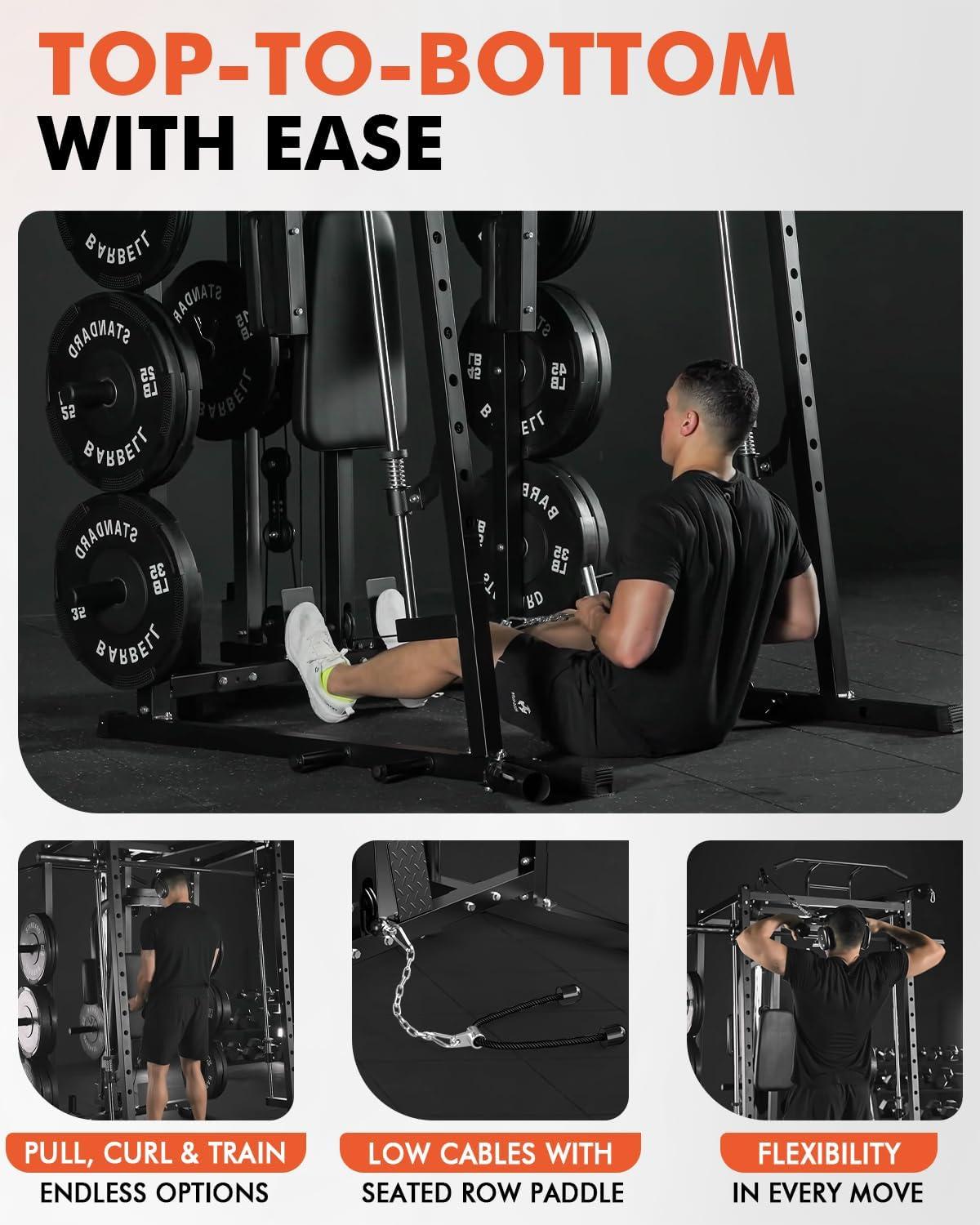 [All-in-One Fitness Marvel] The CS00 Smith Machine is a true home gym centerpiece — combining a Smith bar, half rack, pec deck, lat pulldown, seated cable row, and cable crossover system in one space-saving design. Includes premium accessories like cable handles, a lat bar, straight bar, curl bar, and triceps rope to support total-body training