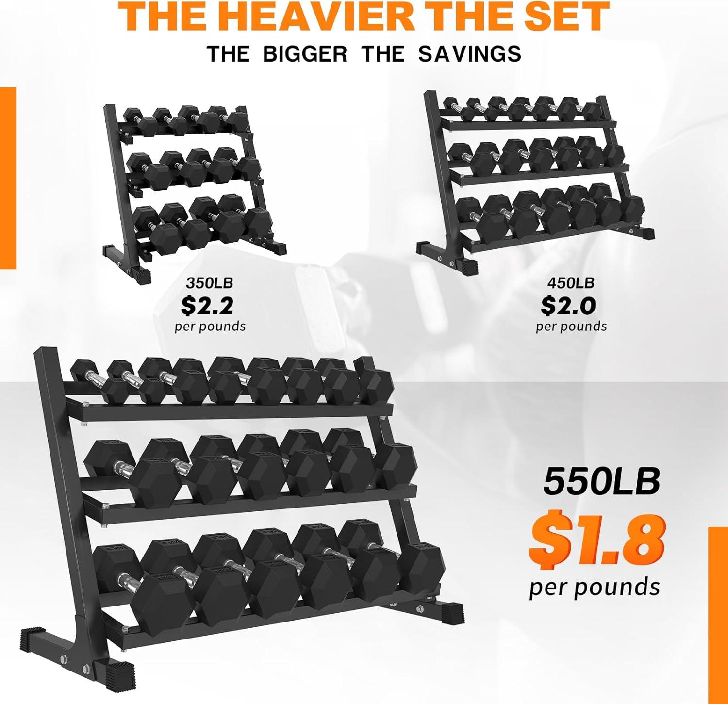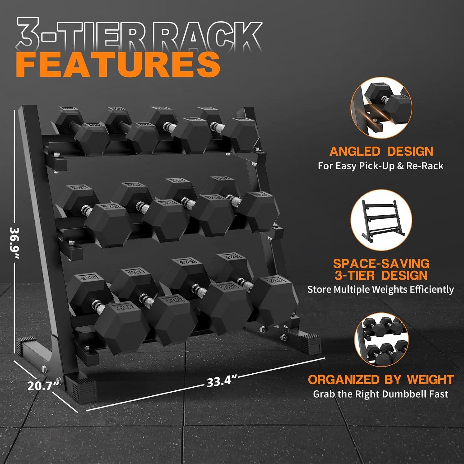 [CONVENIENT STORAGE SOLUTIONS] The dumbbell rack features a steel frame with a durable black powder coating, ensuring stability and longevity for long-term use. All dumbbell sets come with a standard 3-tier weight storage rack: the 350 lb set uses a slightly smaller rack, while the 450 lb and 550 lb sets share the same rack size.