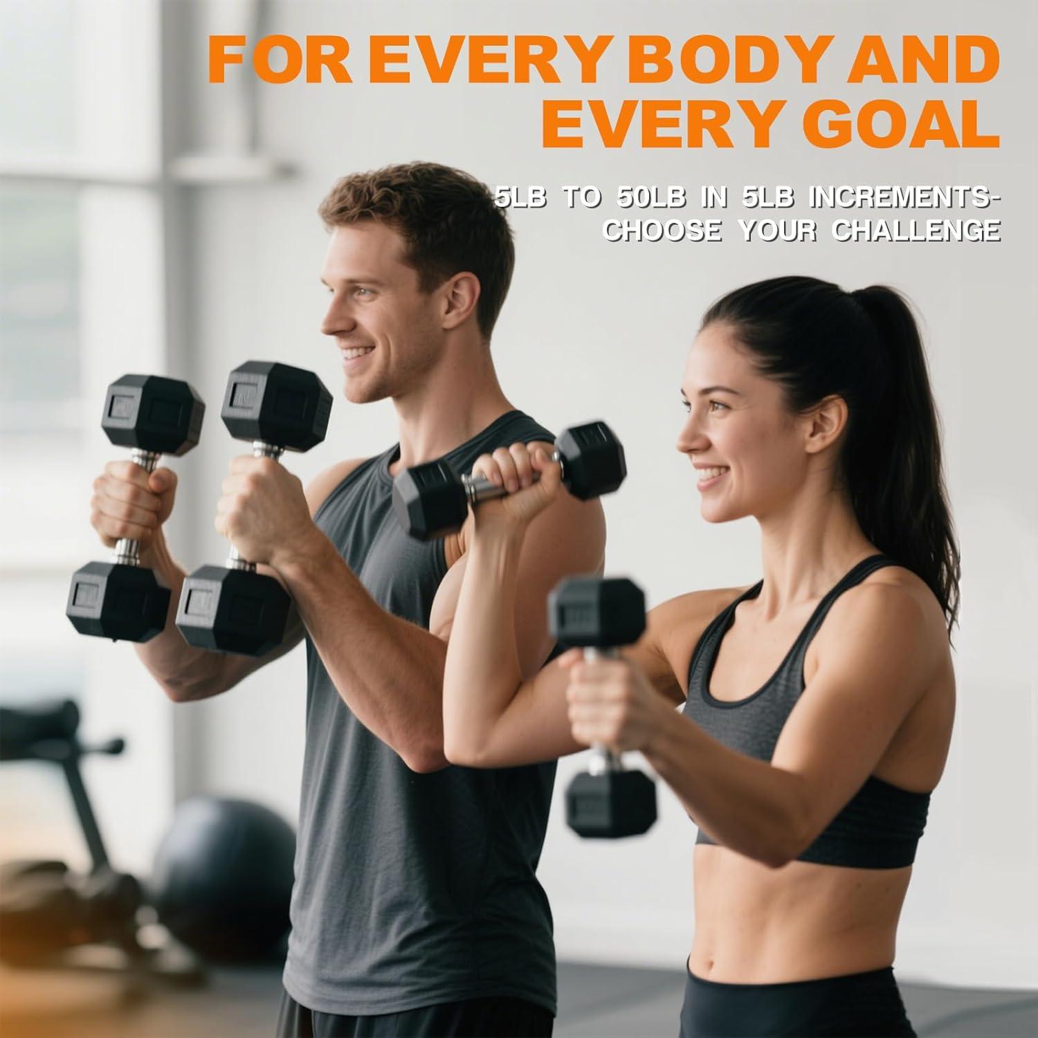 [STURDY AND DURABLE] The hexagonal rubber-encased head design effectively prevents the dumbbell from rolling and makes storage more convenient. High-quality solid cast dumbbells are wrapped in rubber, not only able to withstand intense workouts but also protect the floor from damage, resist rust and wear, ensuring that the dumbbells maintain their durable performance for years of use.