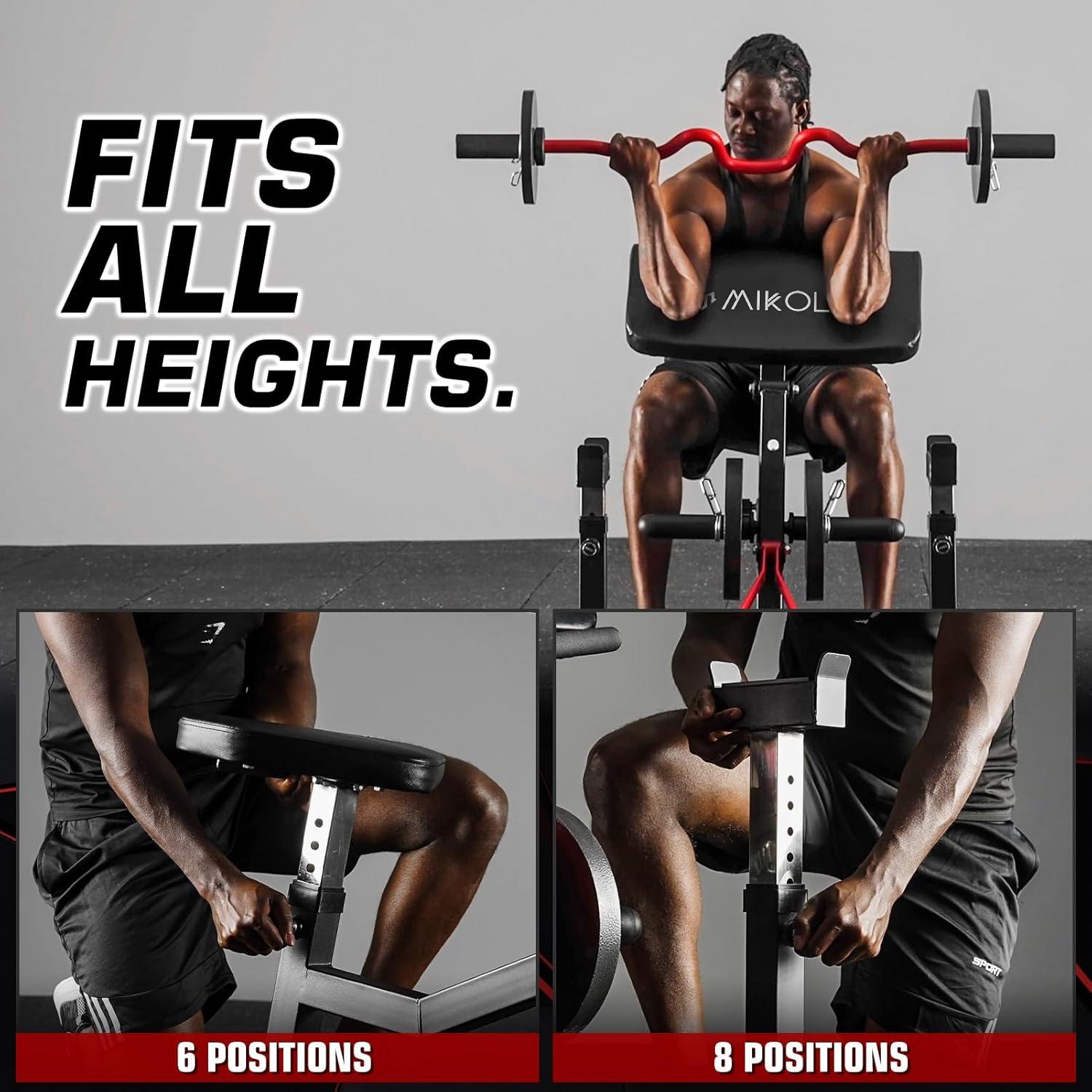 【Adjustable Features】: Easily customize the seat and preacher pad positions.Wide range of adjustment options, making it suitable for almost any body size.Rack with 8 height settings, with rubberized shelves for free training with barbells or dumbbells.